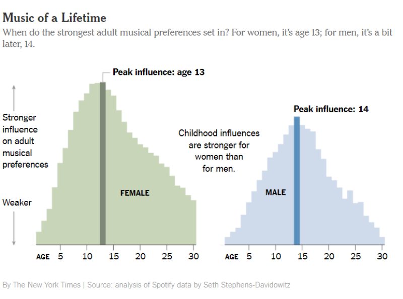 Un âge est clé. À quatorze ans, nous créons le pic de nos références futures. Nos musiques préférées sont influencées par notre période ado, y compris si on écoute les disques de nos parents bien sûr. Par exemple Creep de Radiohead est adoré par les hommes de 45 ans, car ils avaient 14 ans à la sortie du tube, en 1993. Seth Stephens-Davidowitz, journaliste du New York Times a effectué une analyse passionnante sur ce phénomène représenté par le graphique ci-dessous.