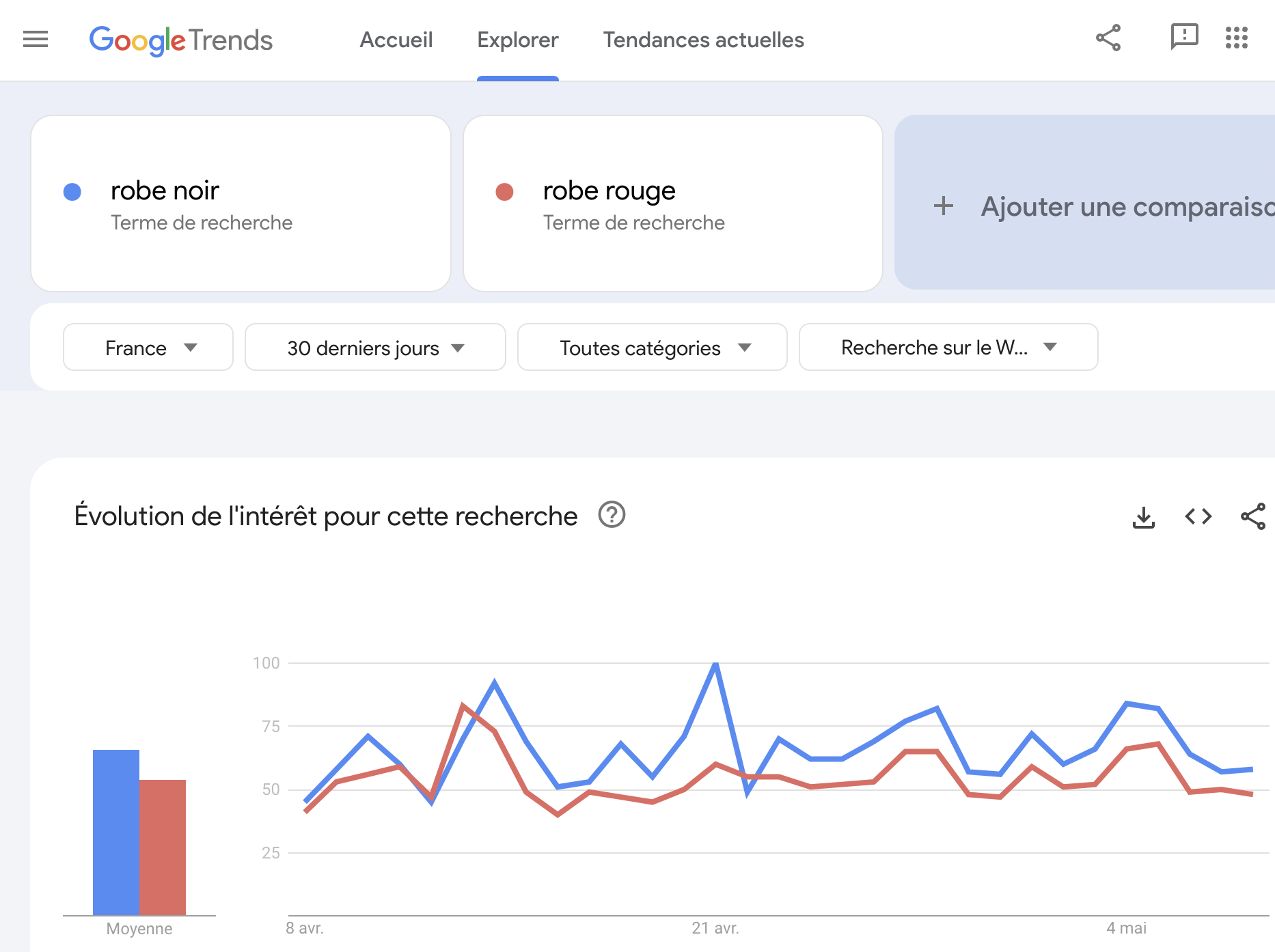 Comment fait-elle pour déterminer le style à la mode les jours suivants ? Shein peut utilise « Google Trend », pour suivre les tendances de millions de produits (exemple avec Robe Noir vs Robe Rouge ci-dessous)
